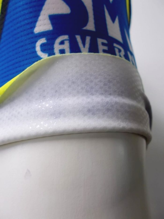 All’estremità delle maniche presenta un elastico a taglio vivo con all’interno dei pallini di silicone antiscivolo.
