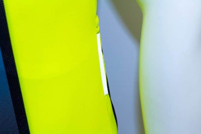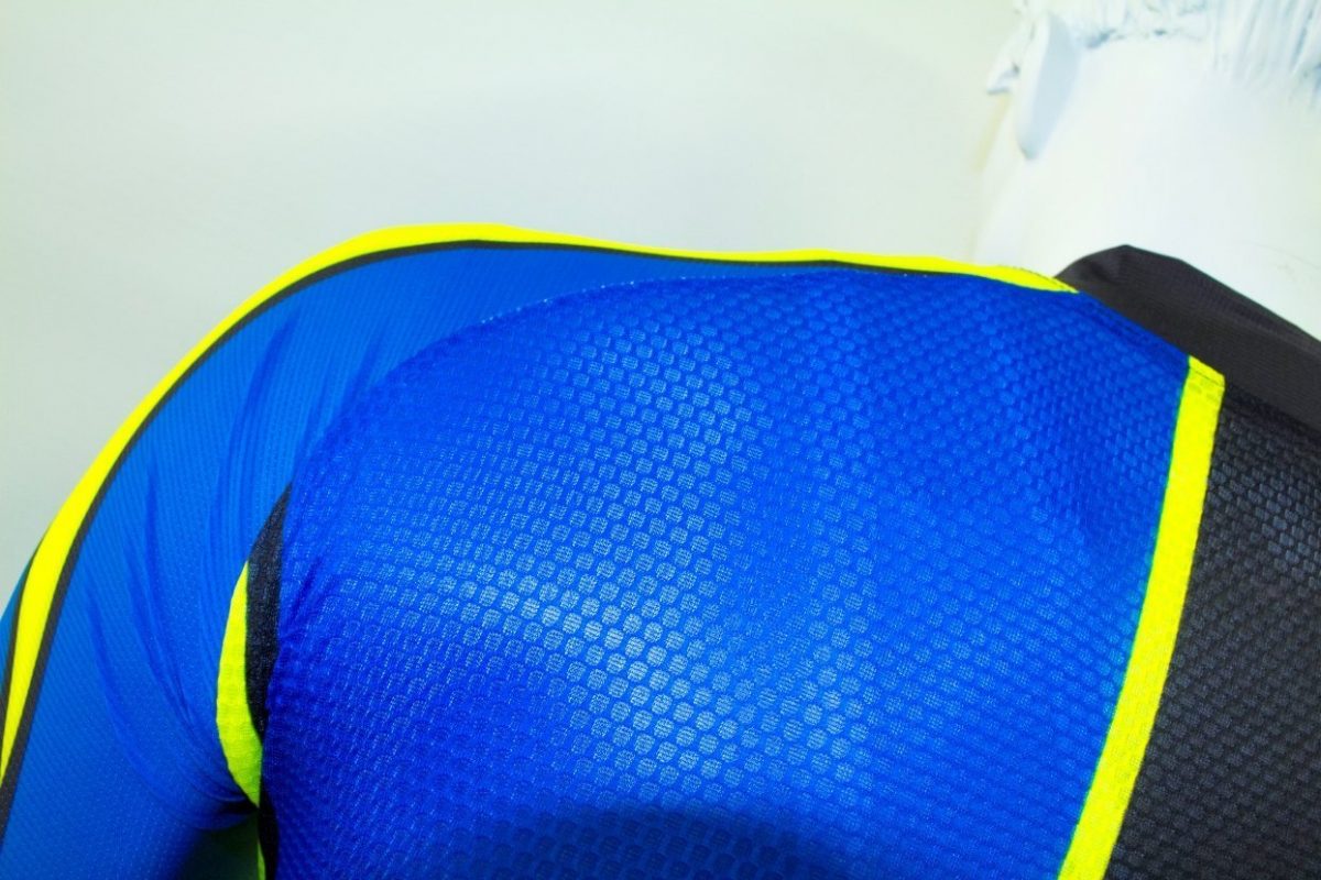 Parte posteriore in 3D (compresa la tasca) intessuta a nido d’ape 100% poliestere in microfibra, per una maggiore traspirabilità e per un maggior sostegno delle tasche.