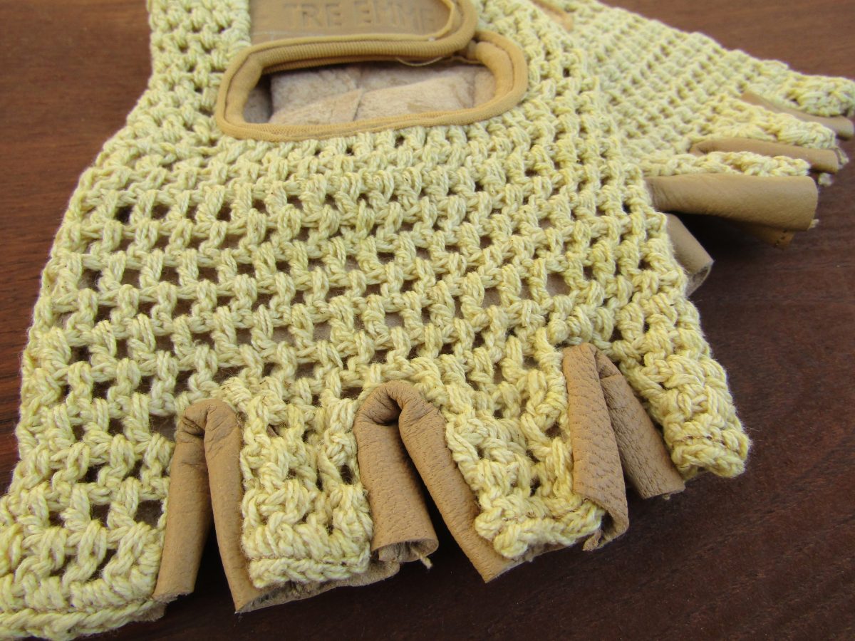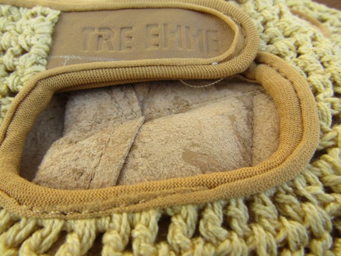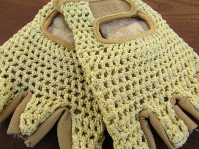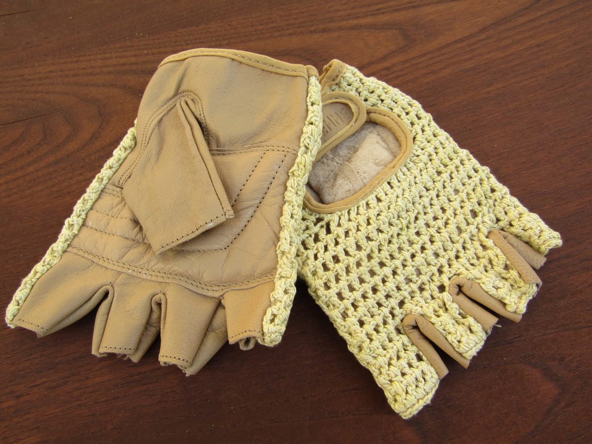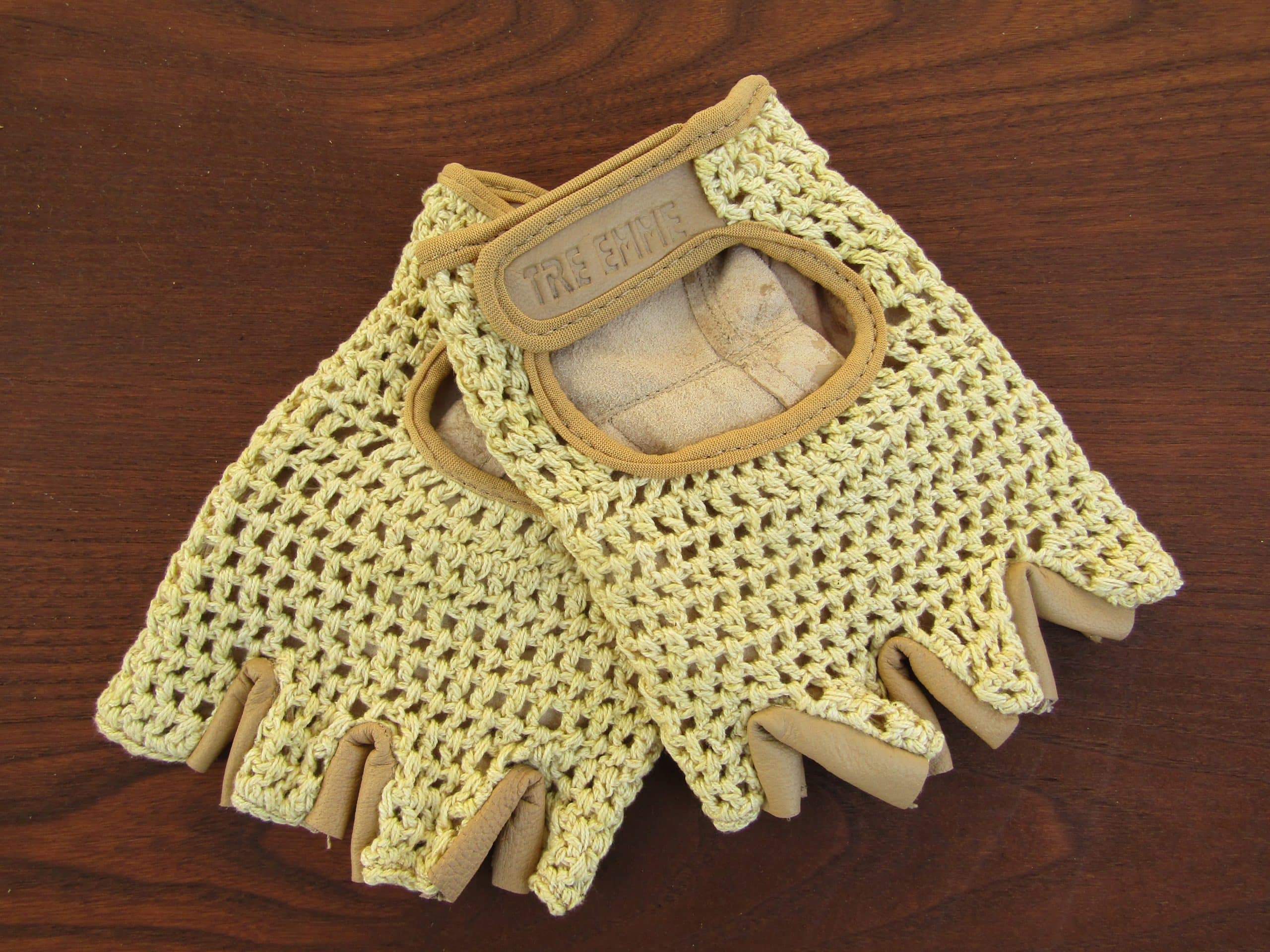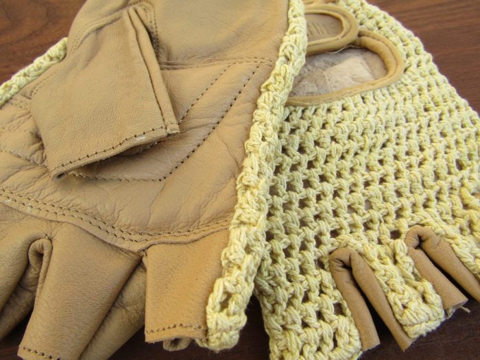 Guantini da ciclismo vintage. Dorso in cordura, palmo in ecopelle imbottito (potrebbero esserci leggere variazioni nel colore beige della pelle rispetto a quello mostrato in foto). Chiusura al polso con velcro e incisione TRE EMME. Colore: Beige