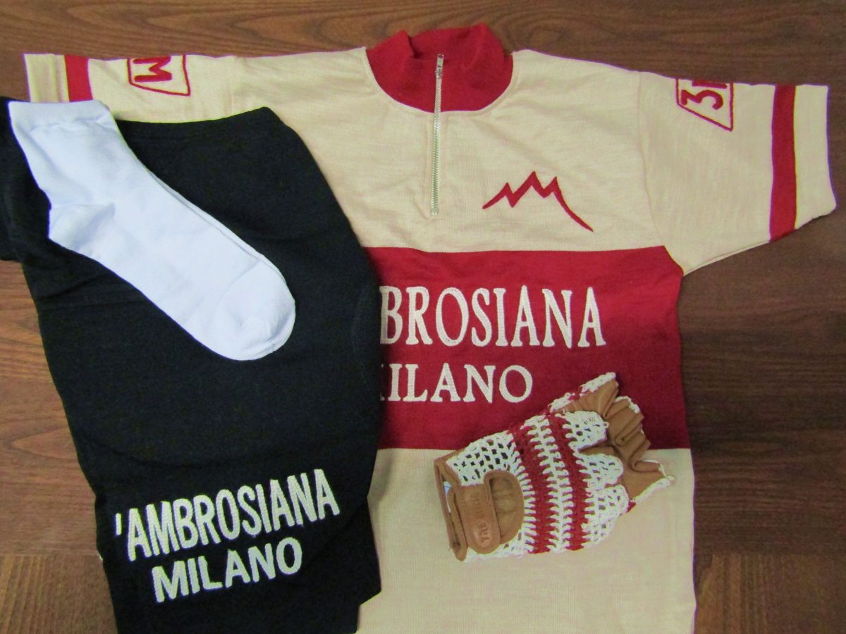 Completo L’Ambrosiana comprendente maglia vintage manica corta anni 70 con ricamo “L’Ambrosiana” (codice T660), pantaloncino vintage in lanetta nera con ricamo “L’Ambrosiana” (codice P785), guantini vintage di colore bianco/rosso (codice G403) e calzini bianchi (codice R656).