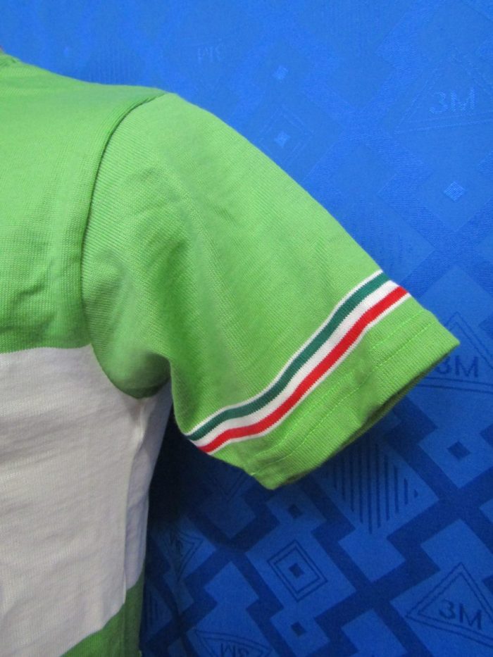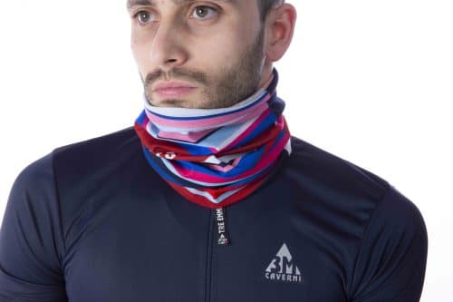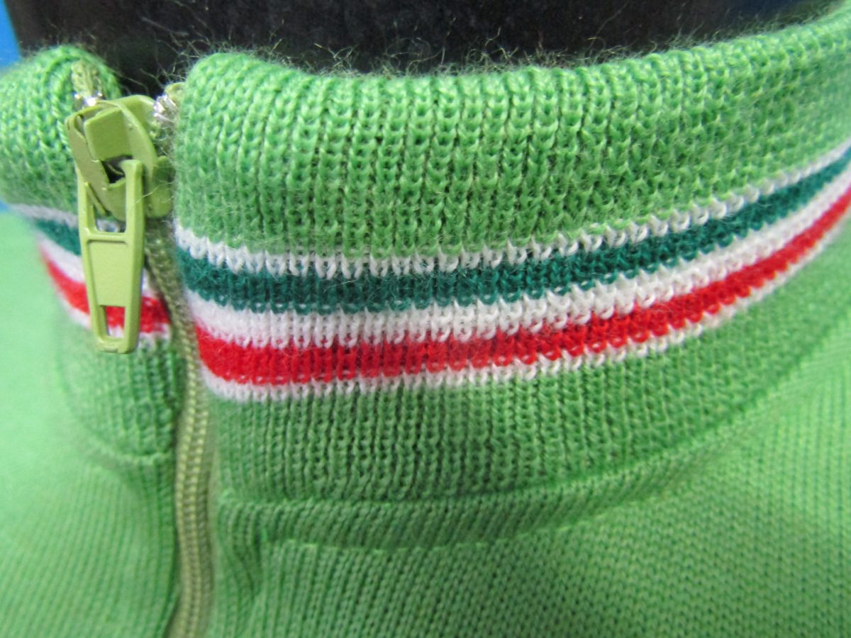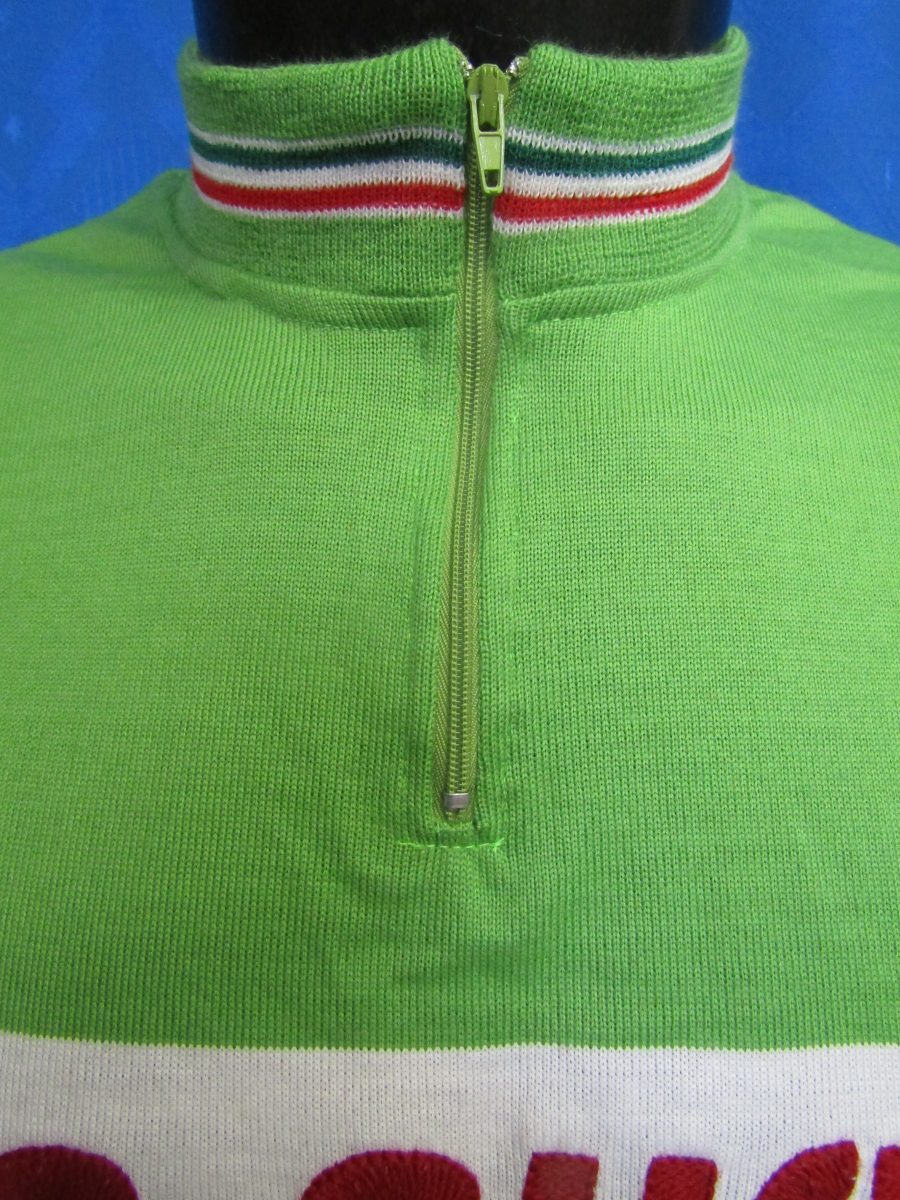Collo realizzato in costina con sistema «uno e uno» e assemblato a «taglia e cuci» come gli originali 3M Caverni dell’epoca. Rifiniture tricolore.