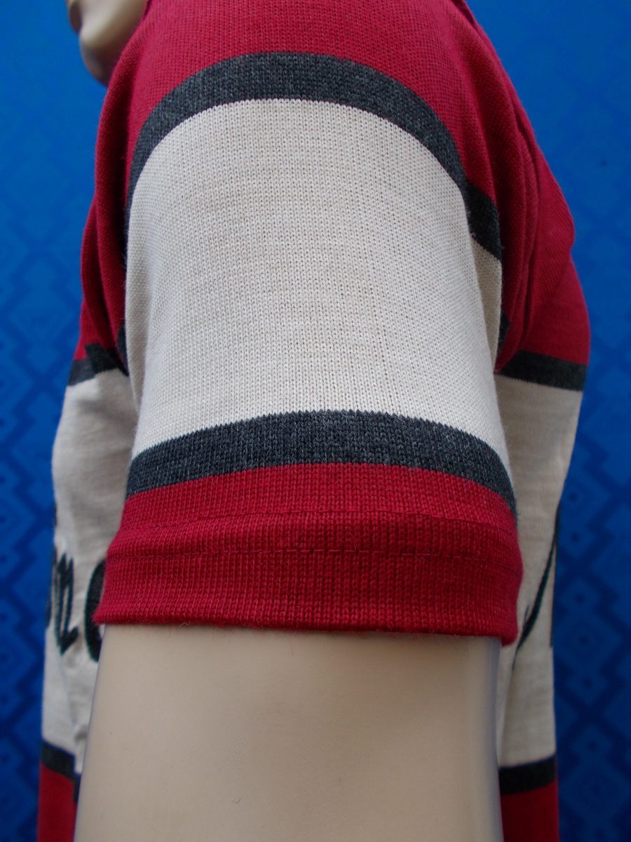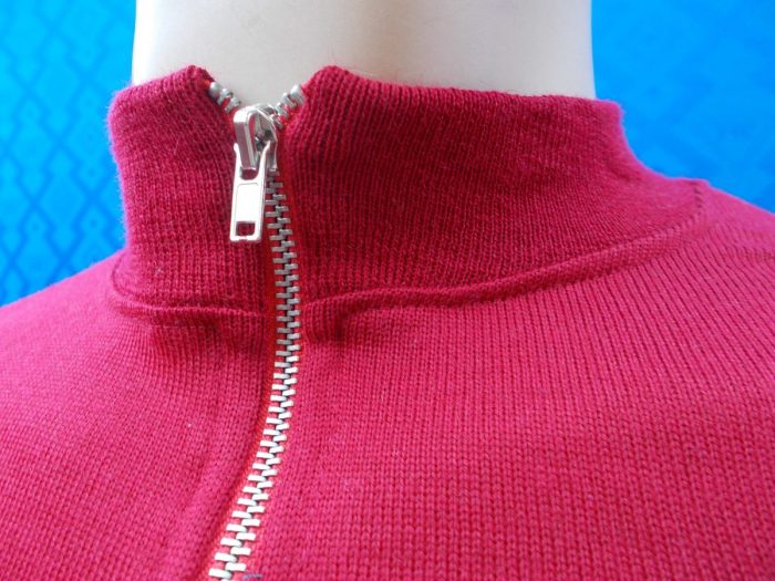 Collo realizzato in costina con sistema «uno e uno» e assemblato a «taglia e cuci» come gli originali 3M Caverni dell’epoca. Rifiniture tricolori.