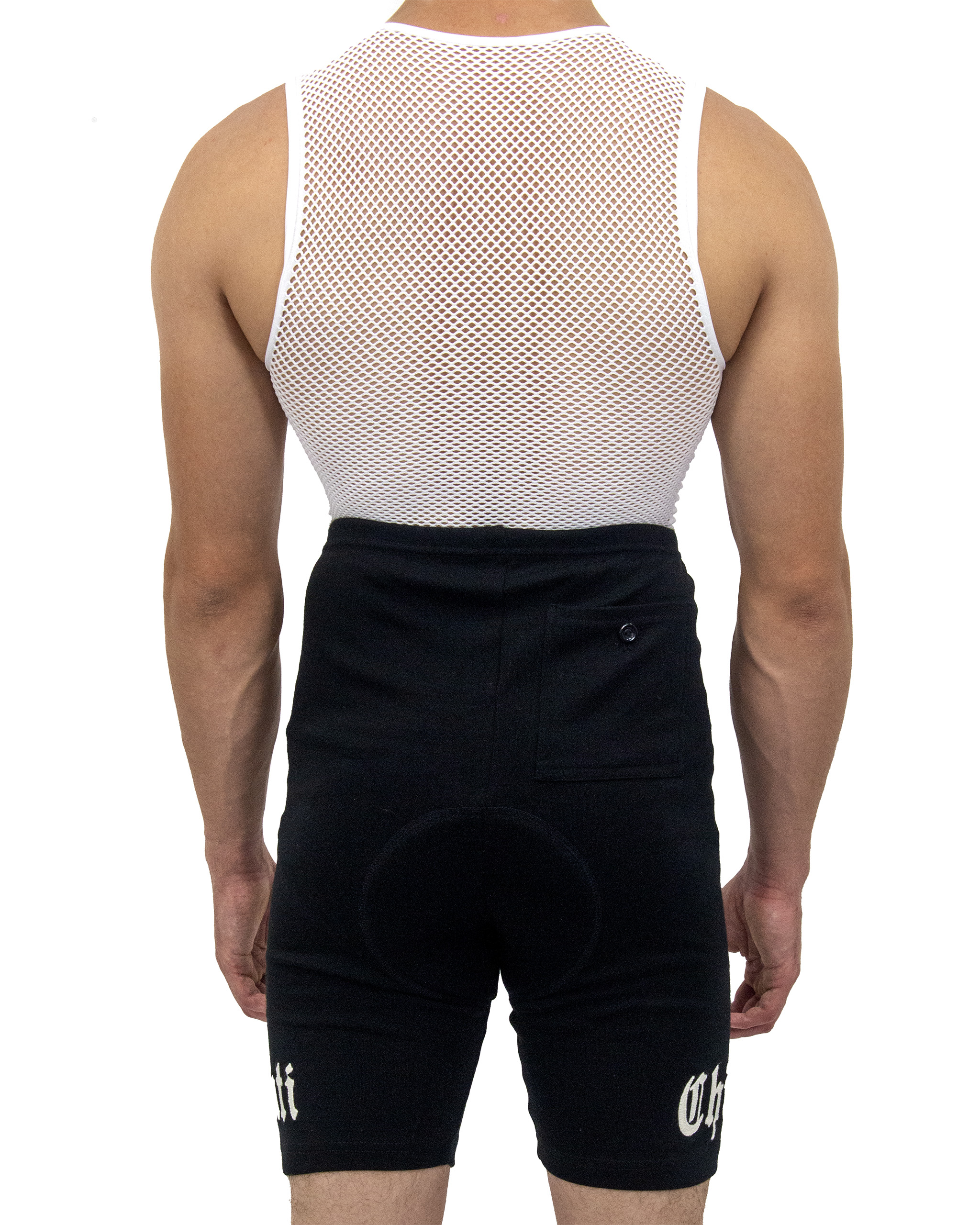 Pantaloncino Ciclismo Vintage in lanetta nera con ricamo in filo di lana bianco Chianti.