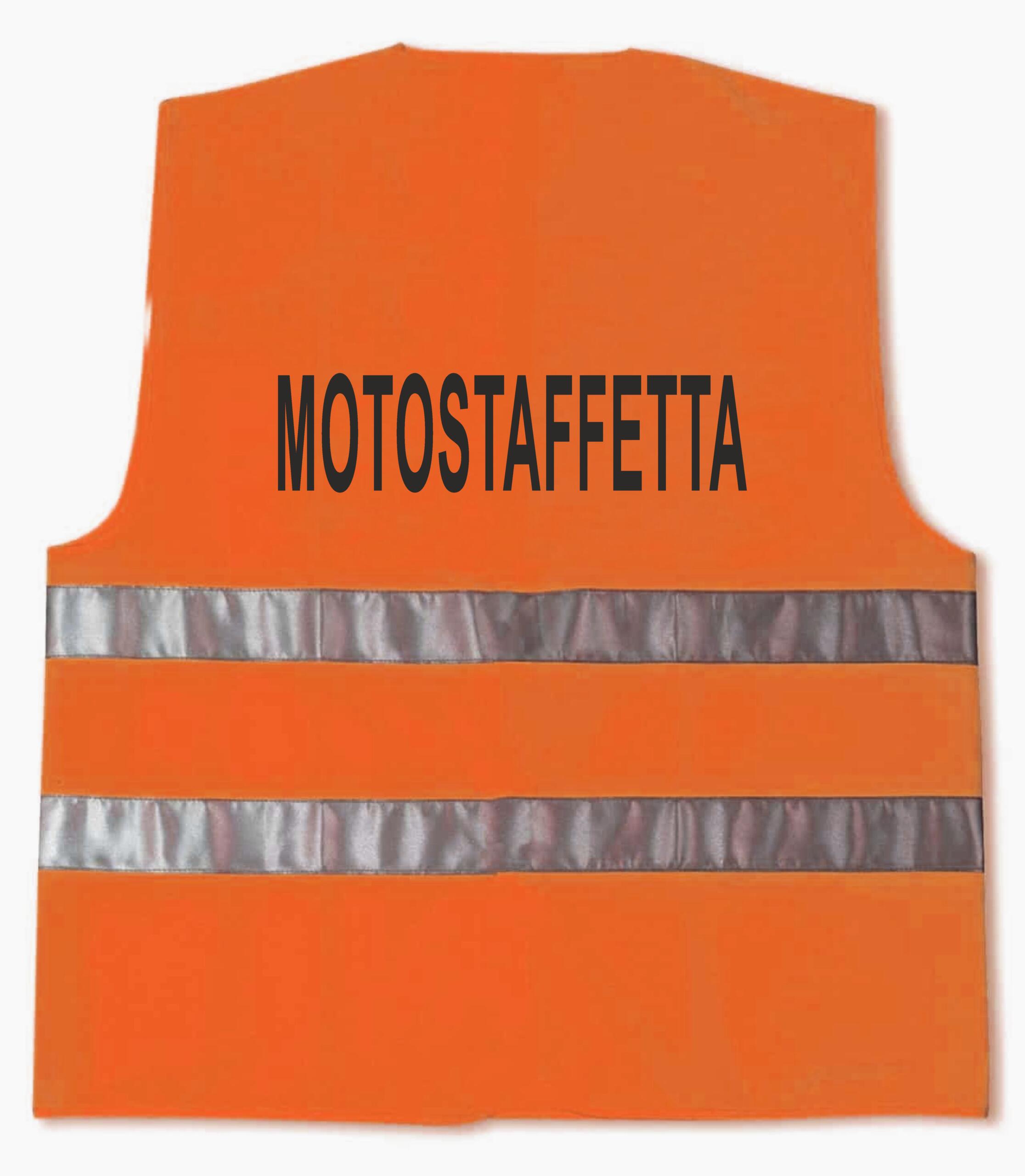 Gilet Alta Visibilità Arancione con stampa MOTOSTAFFETTA in nero.